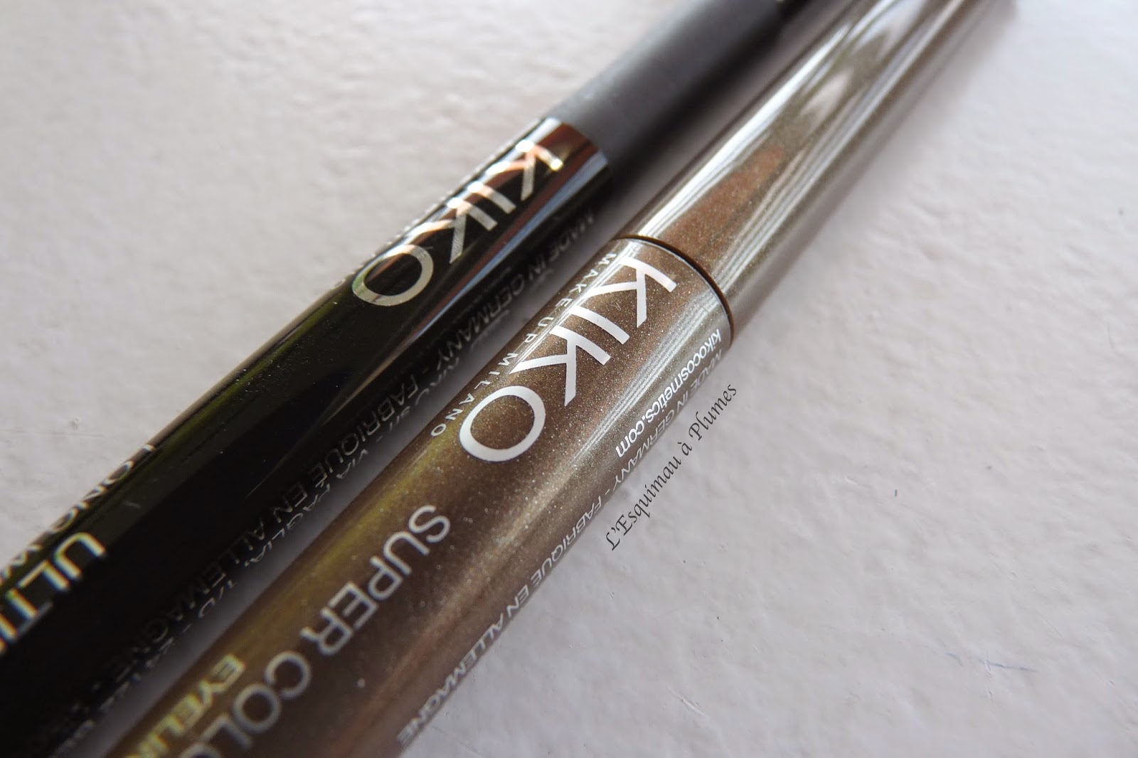 Je débarque donc chez Kiko, toute contente, et me retrouve devant le petit comptoir des eye liners : 2 petits bleus attendaient gentiment que je les swatche ! Et là, comme prévu, ce n’était pas ce que je voulais ! Trop clair, trop bleu, pas assez nuit….